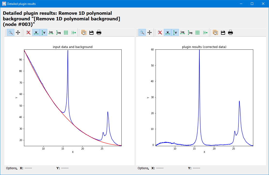 The Results dropdown selection allows to see the results for any plugin in the workflow. The textbox on the left gives you additional information about the plugin results, the window on the right plots the 2d image or 1d curve. If you are not happy with the results, select the Tweak plugin parameters button at the bottom to open a new window and edit this plugin’s parameters.
